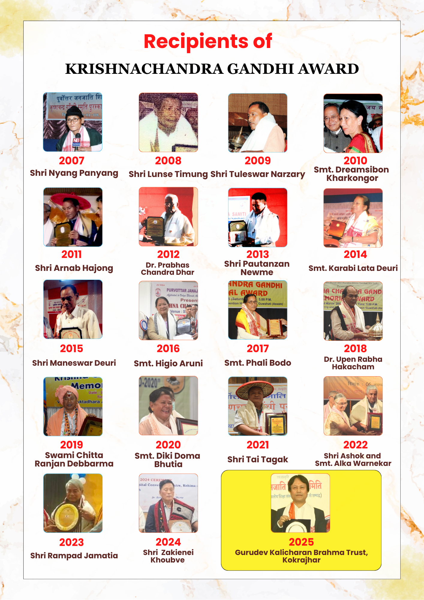Instituted in 2007, the Krishnachandra Gandhi Award honors individuals and organizations who have made exceptional contributions to education in Janajati regions.